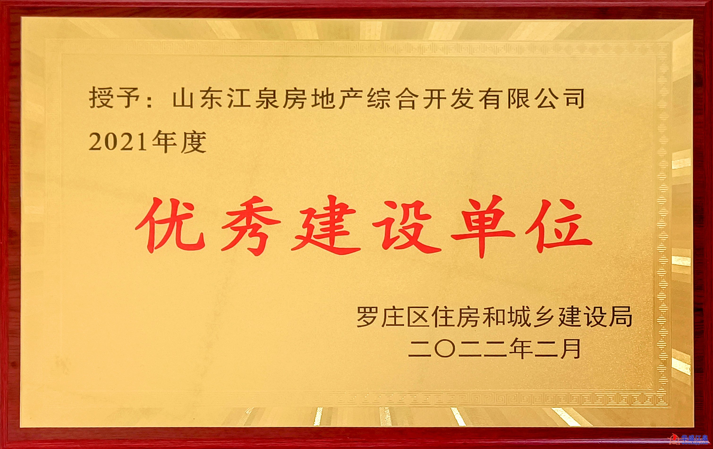 虎年新春,捷報頻傳。2月13日,山東江泉房地產(chǎn)綜合開發(fā)有限公司被羅莊區(qū)住建局表彰為“2021年度優(yōu)秀建設(shè)單位”。在此之前,山東江泉物業(yè)管理有限公司被羅莊區(qū)住建局、羅莊區(qū)物業(yè)管理行業(yè)協(xié)會表彰為“2021年度物業(yè)領(lǐng)域集中整治優(yōu)秀企業(yè)”,由其服務(wù)和管理的江泉國際、歐羅花園兩家小區(qū)同時獲得羅莊區(qū)住建局、羅莊區(qū)物業(yè)管理行業(yè)協(xié)會表彰的“物業(yè)服務(wù)標(biāo)準(zhǔn)化建設(shè)優(yōu)秀小區(qū)”榮譽(yù)稱號。