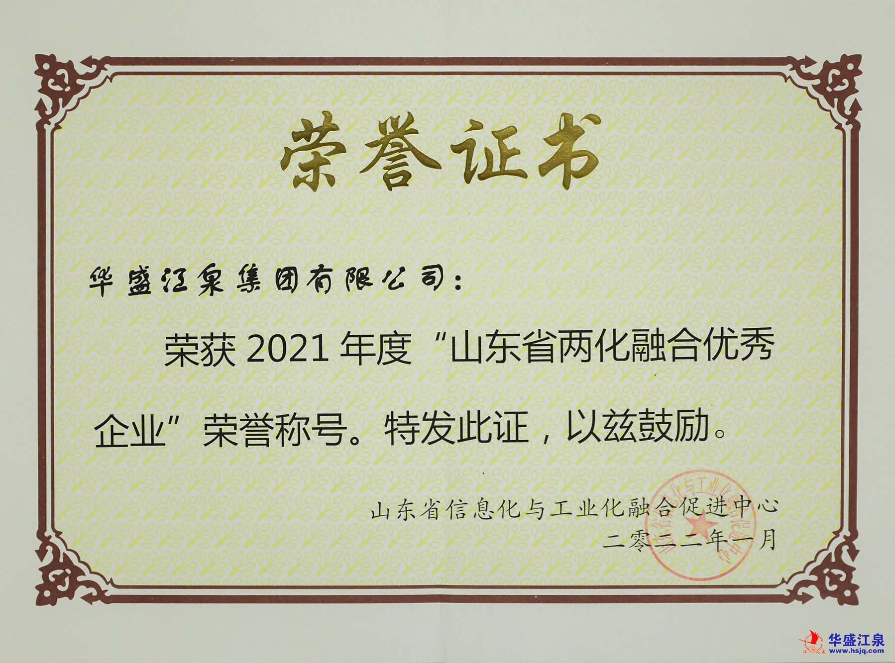 近日,經(jīng)山東省兩化融合相關(guān)部門(mén)及專(zhuān)家團(tuán)共同審核評(píng)定,華盛江泉集團(tuán)獲得“2021年度山東省兩化融合優(yōu)秀企業(yè)”榮譽(yù)稱(chēng)號(hào),這是繼2018年后集團(tuán)再度獲評(píng)省級(jí)兩化融合優(yōu)秀企業(yè)稱(chēng)號(hào)。