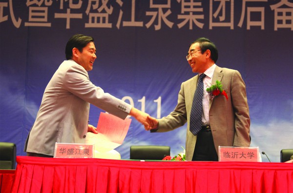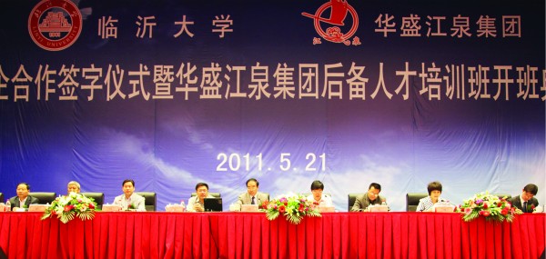 2011年5月21日,臨沂大學華盛江泉集團校企合作簽字暨華盛江泉集團后備人才培訓班開班盛典在江泉城舉行。出席典禮儀式并在主席臺就坐的領導有:臨沂大學校長韓延明博士,臨沂大學商學院院長、教授、許汝貞博士,臨沂大學繼續(xù)教育處處長李殿勇教授,臨沂大學商學院培訓中心主任、王郡華教授,臨沂大學商學院刁玉柱博士,羅莊區(qū)人民政府吳漢林副區(qū)長,沈泉莊黨委于孝燕書記,沈泉莊黨委副書記、華盛江泉集團高洪路總經(jīng)理,沈泉莊黨委副書記、華盛江泉集團王廷寶副總經(jīng)理,以及臨沂電視臺、臨沂人民廣播電臺、臨沂日報社等新聞媒體的記者和集團所有高管、各單位管理人員及后備人才等,共800余人出席會議。